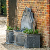 The Tiber is a more classically designed water fountain, with a simple curved top and single spout, and our trademark “Belgian Circle” design on the front reservoir. The Tiber Fountain would bring tranquility and peace to any garden space or courtyard. The Tiber arrives in an already pre-weathered finish that will get slightly lighter over time. This water feature is completely self contained, so you will not require a water supply to the feature. The Tiber works by recycling water from the catch reservoir and pumping it into the back reservoir. This fountain includes a built in Submersible pump, and is now available in three styles: Square, Tall and the Curved Trough with different spouts. The 'Square' and 'Tall' arrive with a Tubular Spout and the 'Curved' has a semi-circular water spout.